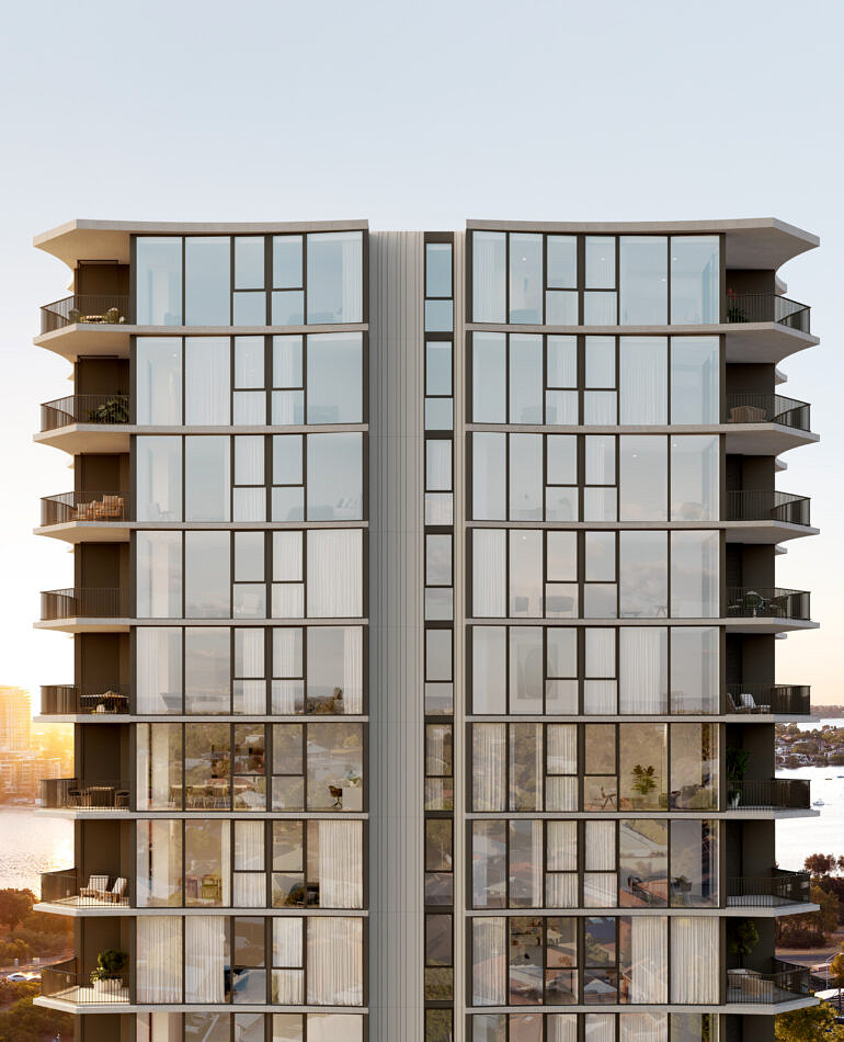 At once distinctly modern yet timeless in its composition, Lago’s architecture makes a sophisticated and classic contribution to the Como locale. The symmetrical and well-articulated facade works cohesively with subtle curves to soften its linear form. Exquisite recesses create movement within the architecture, reflective of its riverside setting. Refined materiality and organic textures reference the natural beauty of Lago’s enviable location whilst structured with a contemporary edge. The elegant proportions of the facade’s elements provide a rhythm to each residence whilst the expansive glazing frames breathtaking vistas of the river and its verdant surrounds.